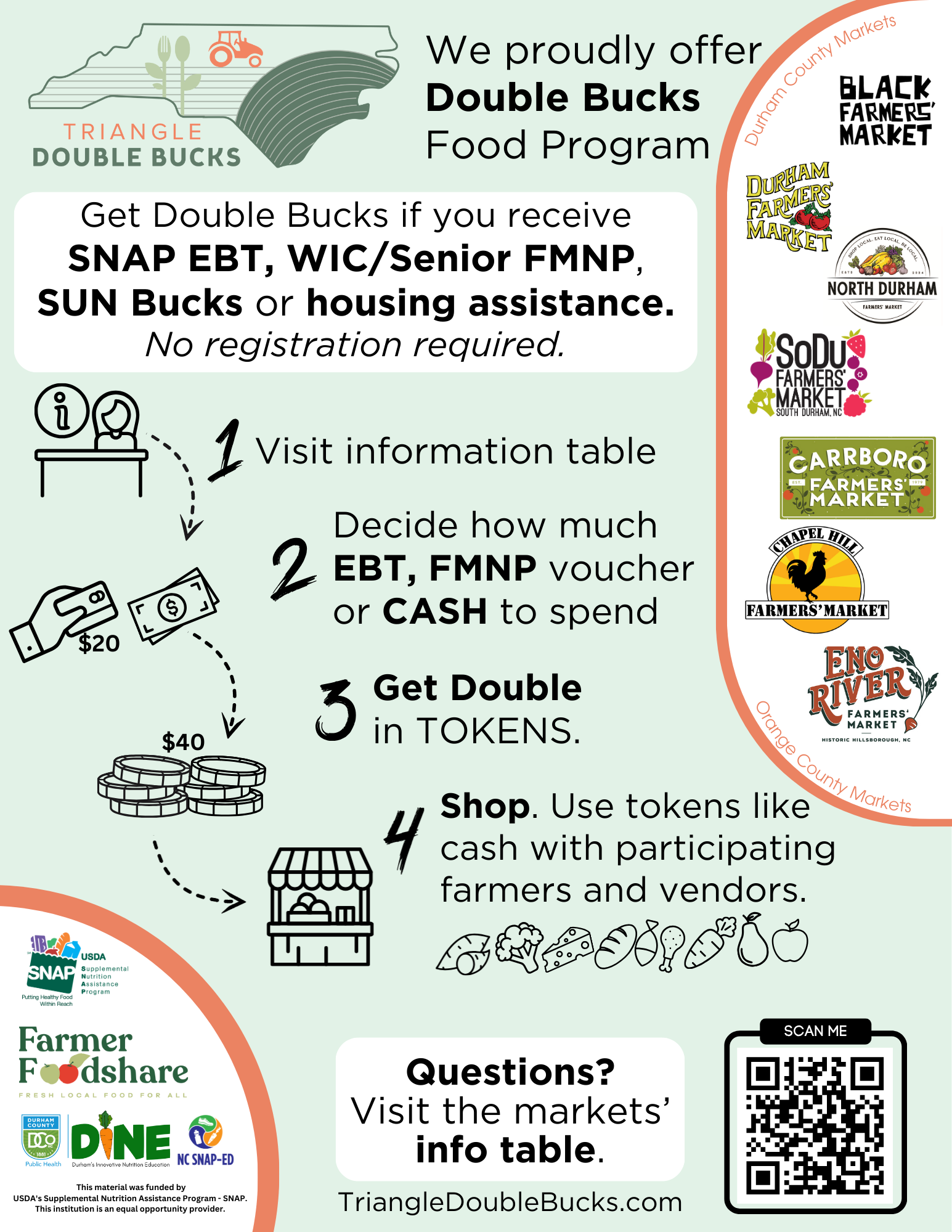 Triangle Double Bucks is a collaborative effort comprising 7 Orange and Durham Counties farmers' markets. The markets started working together in 2019 with a Blue Cross Blue Shield of North Carolina Sponsorship to fund and administer Double Bucks to match unlimited purchases to address barriers that households faced to using their benefits at farmers' markets.